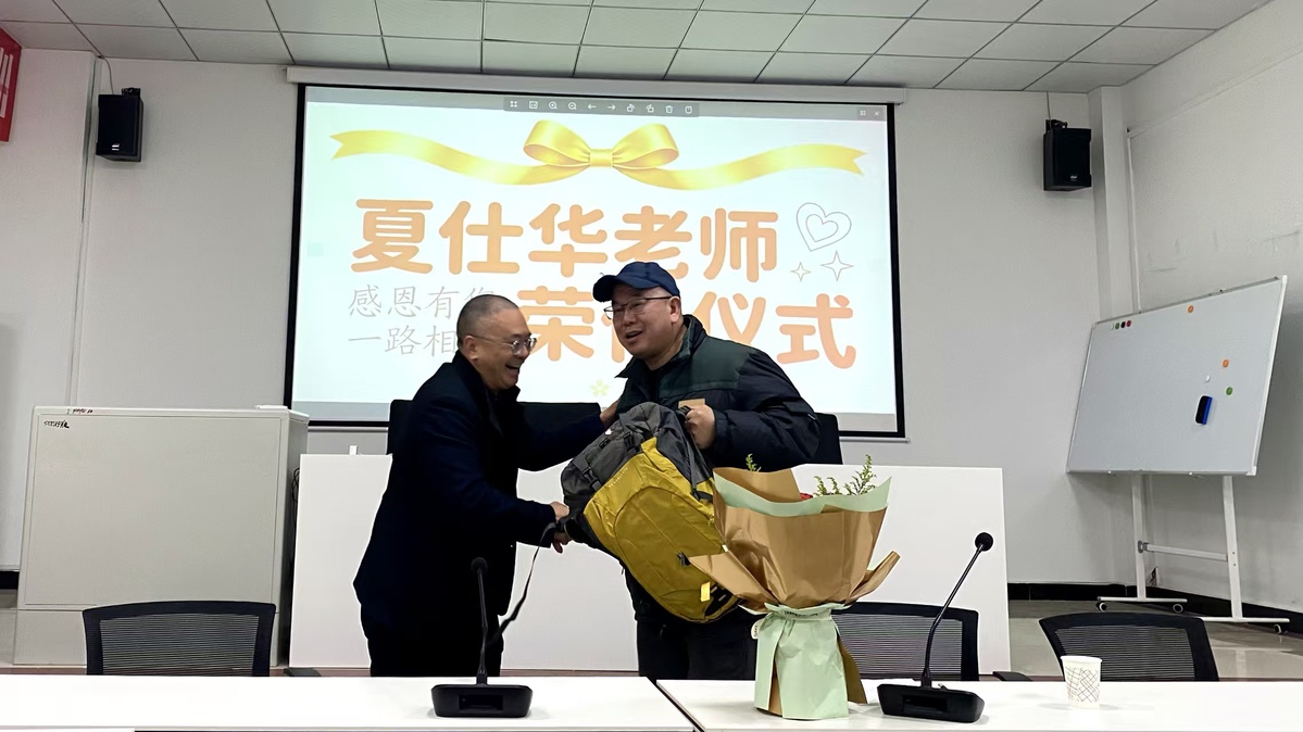仪式最后,李林院长和最年轻的小陈老师代表全体同仁,为夏老师送上了鲜花与礼物。鲜花象征着对夏老师桃李芬芳、一生清雅的敬意,礼物则承载着学院对他荣休生活的美好期许,愿他往后岁月从容自在、喜乐常伴。